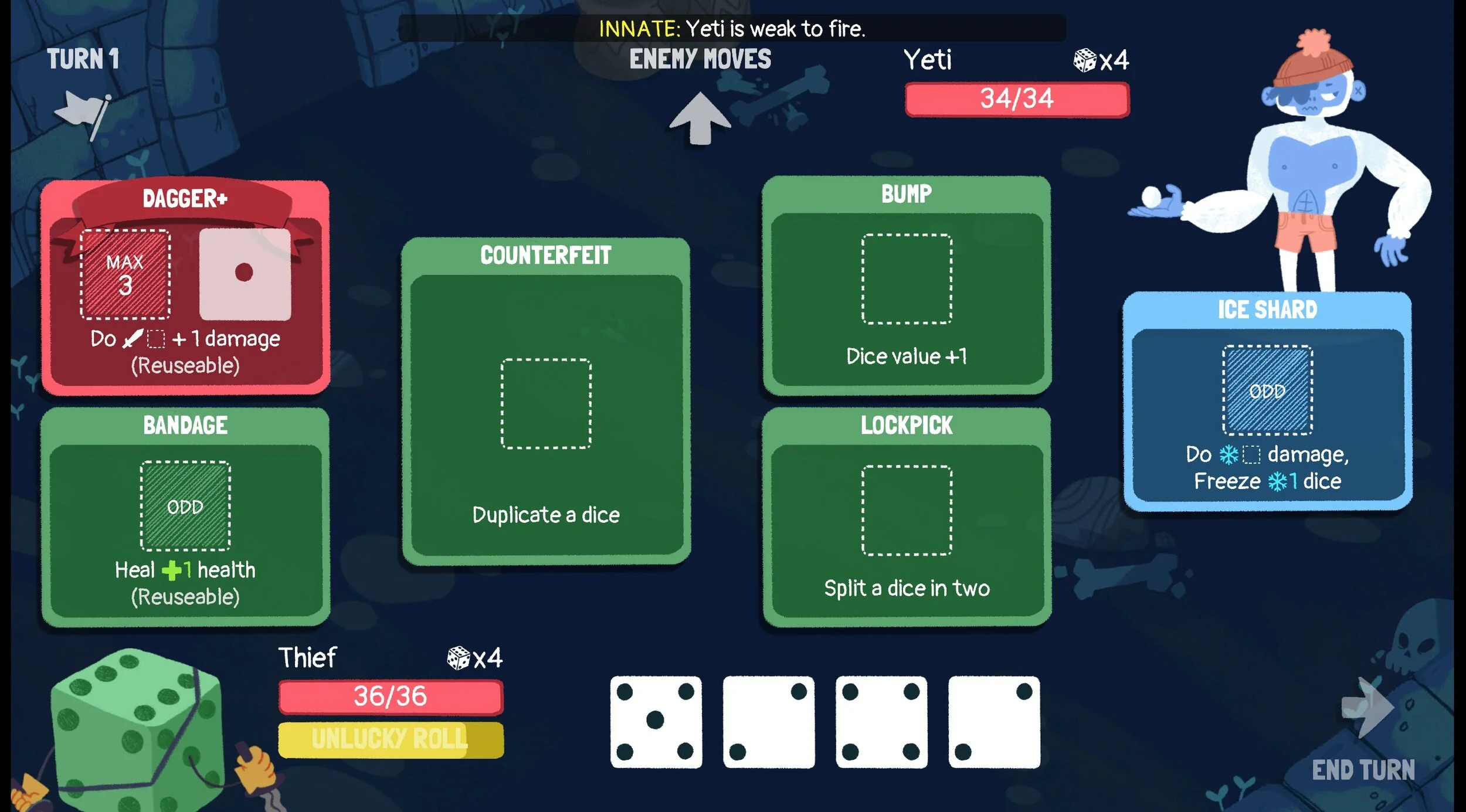 Six classes offer six remarkably different approaches, from the Warrior’s straightforward ability to re-roll undesirable dice to the Robot’s pseudo-Blackjack-y calculating and the Witch’s strange spellbook of equipment. When it comes to roguelikes that offer lots of different class options, there are usually a few I gravitate towards over others, but I think Dicey Dungeons’ spread of archetypes are all genuinely fun in their own ways. Getting a lucky Jackpot on the Robot can dredge victory out of otherwise certain defeat, and the myriad ways in which a Witch can just deal incredible amounts of damage after rolling die after die after die to topple the strongest foes is exhilarating.