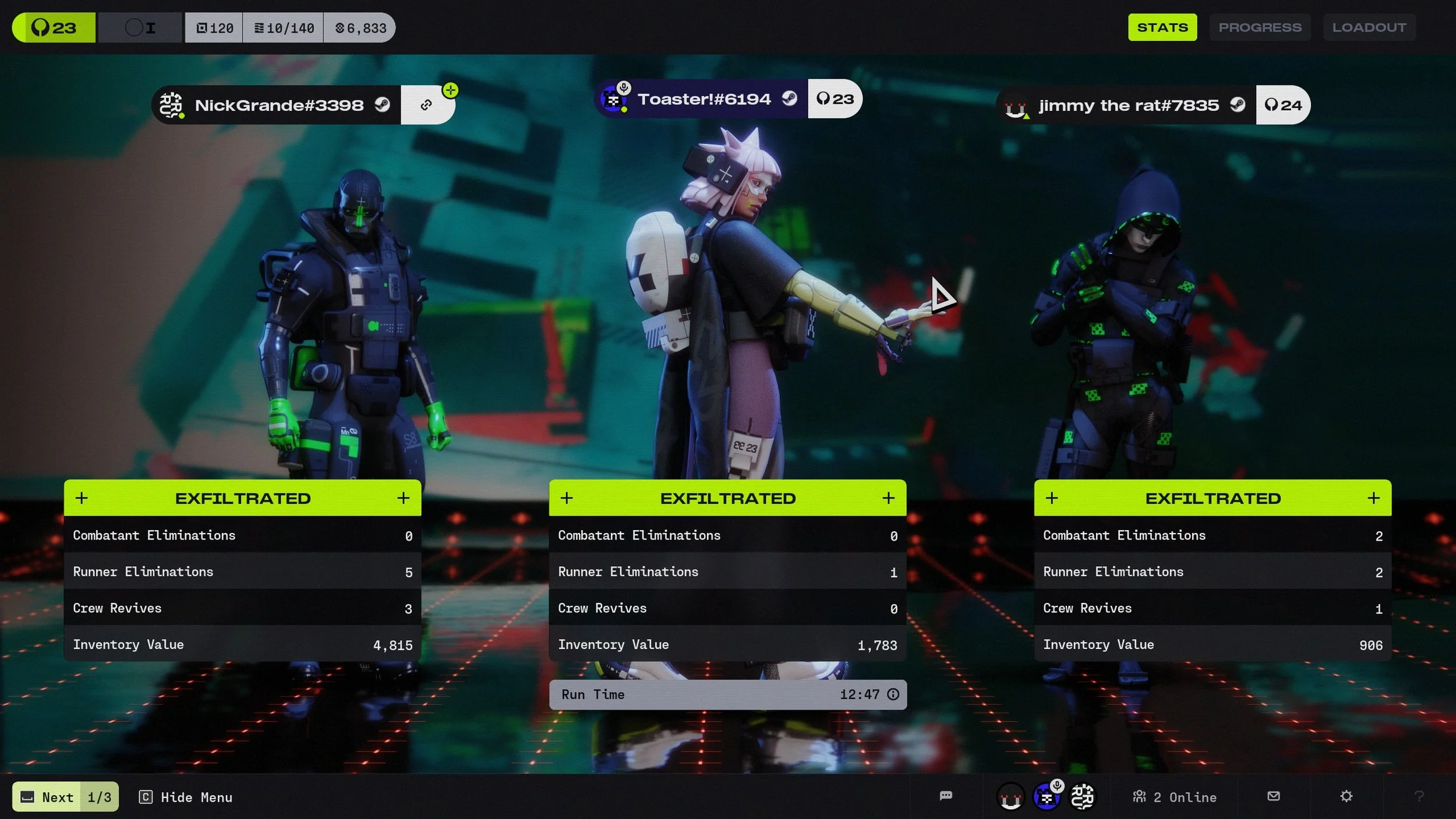 As you work through a season, you’ll complete contracts that advance your reputation with six warring corporations, ranging from the anarchic MIDA and the ritualistic murder cult of Arachne to the “space McDonald’s” consumer products megacorp NuCaloric. These range from simple, fairly generic things like “break a bunch of windows” or “loot this type of item and get it out,” to more involved contracts that move the narrative forward while asking you to gallivant across the maps in search of answers, equipment, and other Runners. You’ll learn more about the reasons they’re invested in finding out what happened to the colony on Tau Ceti IV and the colony ship still floating above it, but more importantly, you’ll be earning proper meta-progression upgrades in the form of better stats, increased access to equipment purchases, and a steady drip of free items that can be claimed daily. Additionally, a basic “sponsored kit” with barebones equipment is always available for free, meaning you’re never going into a run completely empty.